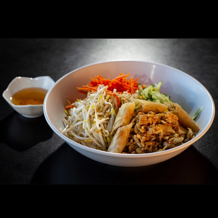 Fresh cucumbers, carrots, bean sprouts, and roasted peanuts with your choice of barbecued meat served over rice noodles with a crispy spring roll